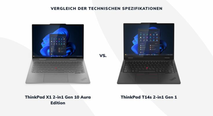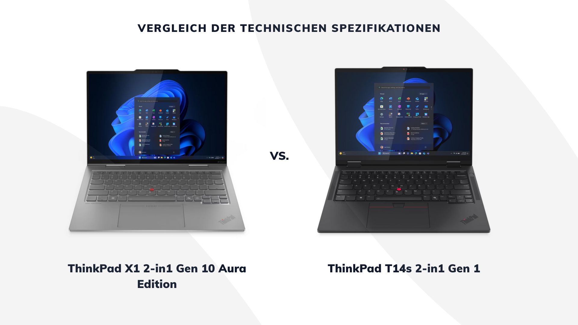 Vergleich der technischen Spezifikationen zweier Convertible-Modelle aus Lenovos ThinkPad-Serie: dem ThinkPad X1 2-in-1 Gen 10 „Aura Edition“ und dem ThinkPad T14s 2-in-1 Gen 1.